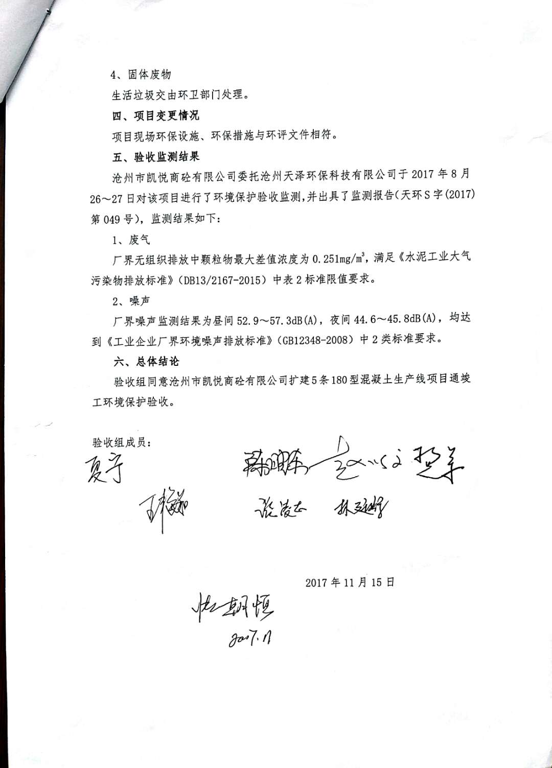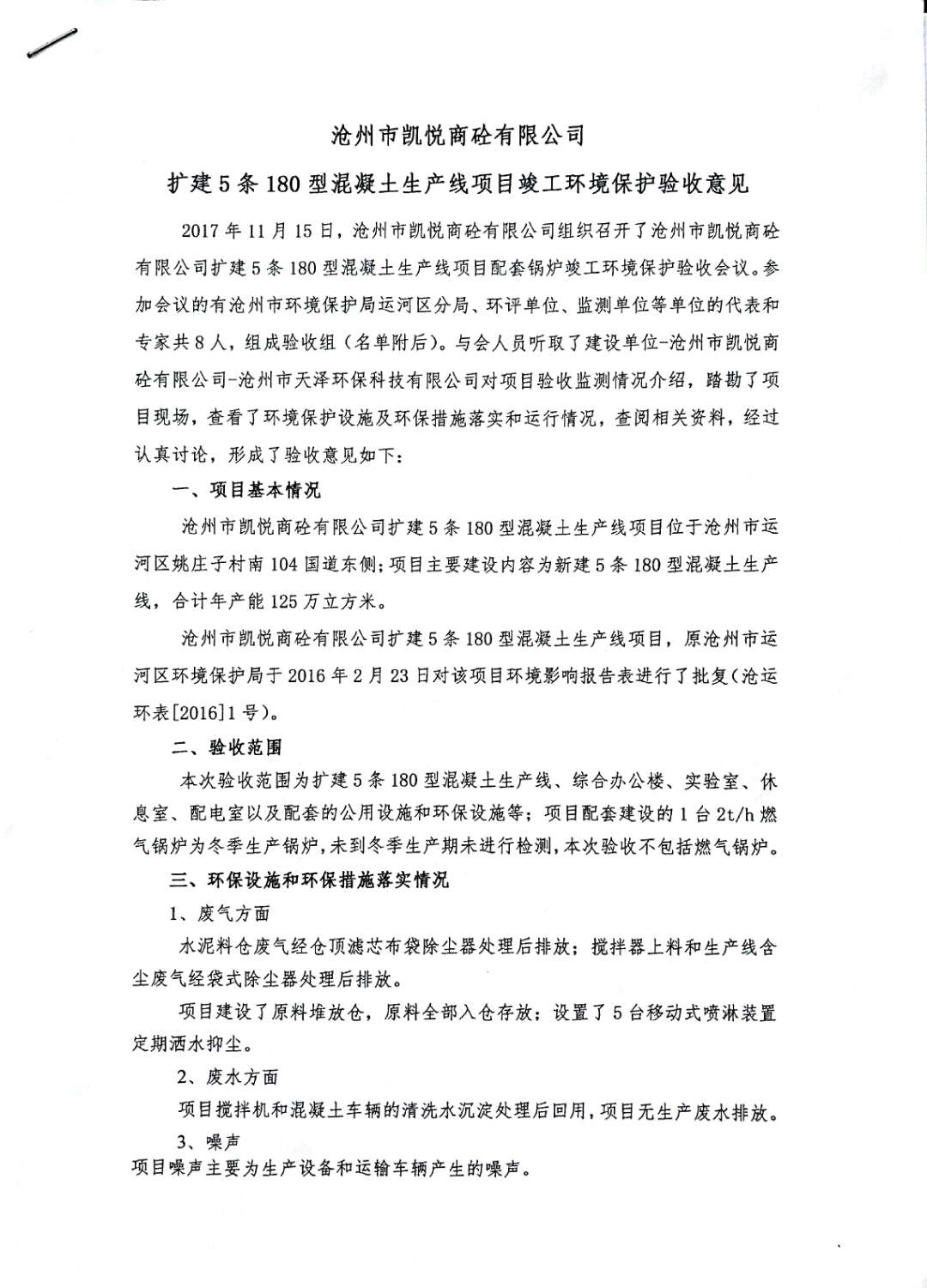 當(dāng)前位置:網(wǎng)站首頁(yè) 〉新聞中心 〉詳細(xì)信息根據(jù)2017年10月1日開始實(shí)施的《建設(shè)項(xiàng)目環(huán)境保護(hù)管理?xiàng)l例》的相關(guān)規(guī)定,2017年11月15日滄州市凱悅商砼有限公司組織召開了《擴(kuò)建5條180型混凝土生產(chǎn)線項(xiàng)目竣工環(huán)境保護(hù)驗(yàn)收》技術(shù)評(píng)估會(huì),滄州市運(yùn)河區(qū)環(huán)境保護(hù)局、環(huán)評(píng)編制單位、環(huán)境監(jiān)測(cè)單位、施工單位及特邀專家組成。驗(yàn)收組對(duì)項(xiàng)目進(jìn)行了實(shí)地查看,檢查了項(xiàng)目環(huán)境建設(shè)和運(yùn)行情況,聽取了各單位對(duì)該項(xiàng)目的竣工驗(yàn)收?qǐng)?bào)告,在充分討論后認(rèn)為本項(xiàng)目在建設(shè)過程中基本執(zhí)行了國(guó)家建設(shè)項(xiàng)目環(huán)境管理制度以及“環(huán)保設(shè)施與主題工程同時(shí)設(shè)計(jì)、同時(shí)施工、同時(shí)投產(chǎn)使用”的規(guī);建設(shè)單位落實(shí)了環(huán)評(píng)報(bào)告及其批復(fù)要求的環(huán)境影響治理措施,減緩了項(xiàng)目建設(shè)運(yùn)營(yíng)中的主要負(fù)面環(huán)境影響,同意通過竣工環(huán)境保護(hù)驗(yàn)收。